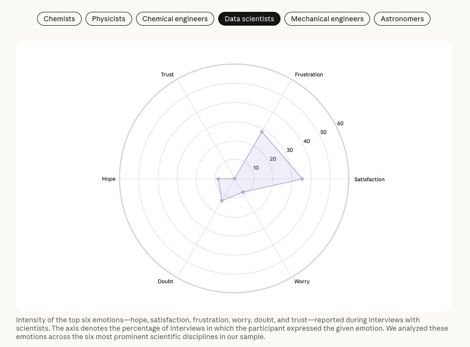 Our interviews with researchers in chemistry, physics, biology, and computational fields identified that in many cases, AI could not yet handle core elements of their research like hypothesis generation and experimentation. Scientists primarily reported using AI for other tasks like literature review, coding, and writing. This is an area where AI companies, including Anthropic, are working to improve their tools and capabilities.